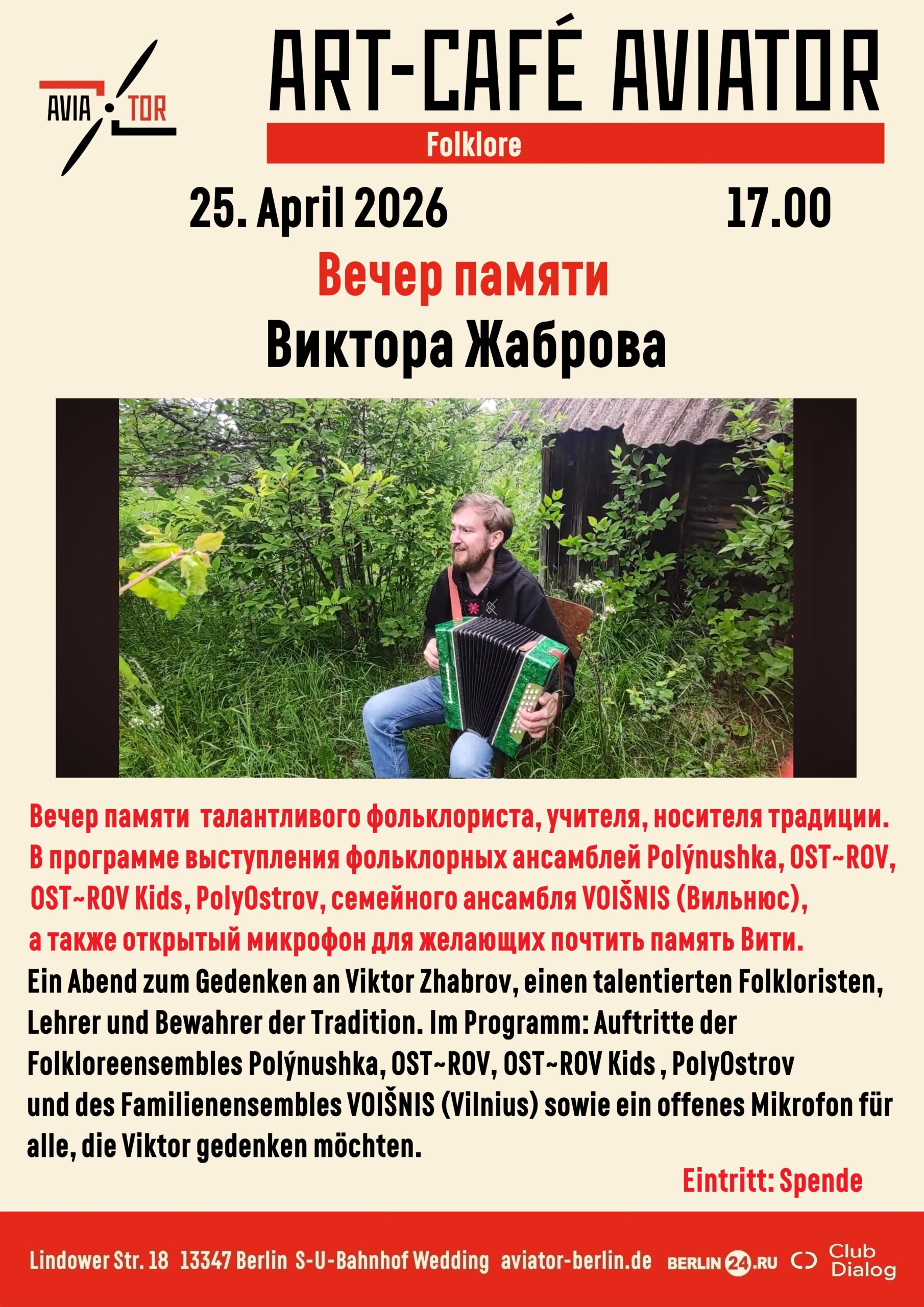 Auf dem Programm stehen Auftritte von Viktor Zhabrovs Freunden und Schülern unter Mitwirkung der Berliner Folkloreensembles Polýnushka, OST~ROV, OST~ROV Kids mit Elizaveta Ustimenko, PolyOstrov, dem Familienensemble VOIŠNIS (Vilnius) sowie eine offene Bühne für alle, die Viktor Andenken ehren möchten.